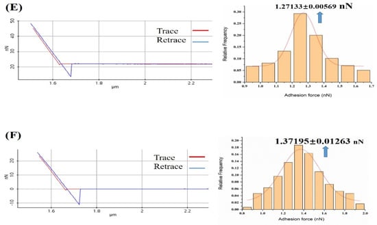 Representation of the force–distance curve and frequency distribution of all measured adhesion forces in the absence and presence of gradient concentration of calcium ions solution: (A) The probability distribution of measured adhesion forces in PBS solution; (B) The probability distribution of measured adhesion forces in 10−7 M concentration of calcium ions in the PBS solution; (C) The probability distribution of measured adhesion forces in 10−6 M concentration of calcium ions in the PBS solution; (D) The probability distribution of measured adhesion forces in 10−5 M concentration of calcium ions in the PBS solution; (E) Probability distribution of the measured adhesion forces in 10−4 M concentration of calcium ions in PBS solution; (F) Probability distribution histograms of measured adhesion forces in 10−3 M concentration of calcium ions in PBS solution. Nonlinear fitting to Gaussian models of the distributions is shown.
