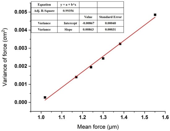 We obtained the total interaction forces between melittin and calmodulin by repeatedly measuring them for 50 to 60 times at each of 6 several randomly chosen points of the calmodulin monolayer in the PBS solution with gradient concentrations of calcium ions (10−7, 10−6, 10−5, 10−4, and 10−3 M). The mean () and variance () of the total 300 times pull-off event measured in the PBS solution are shown in Table 1, while the linear fitting of the plotted versus the variance is presented in Figure 5.