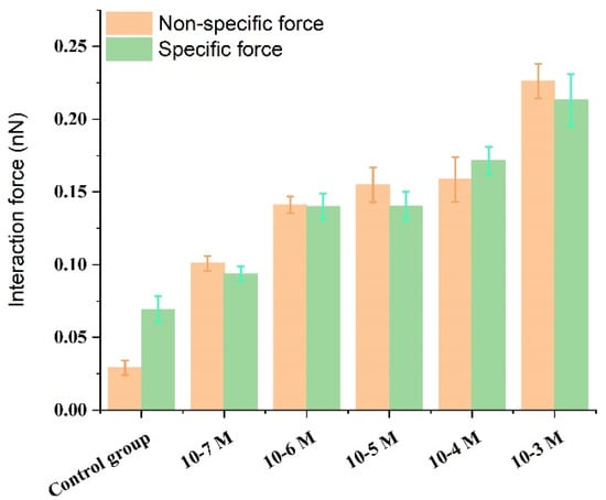 Bar representation presenting specific/nonspecific forces between melittin and calmodulin in the control group and Ca2+ concentration-dependent groups.