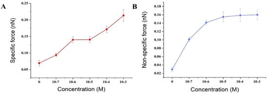 The specific and nonspecific forces between melittin and calmodulin with changing concentrations of Ca2+: (A) the specific forces changing between melittin and calmodulin with increased concentrations of Ca2+; (B) the non-specific forces changing between melittin and calmodulin with increased concentrations of Ca2+.