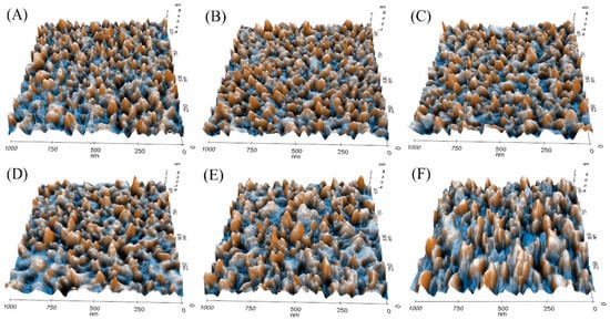 Using software analysis, we found that the roughness of the calmodulin monolayer was changed. The roughness of the topography was integrated and characterized by an average roughness (Ra) (Table 2). The results showed that the average roughness of calmodulin in PBS solution without calcium ion was 1.616 nm. With the addition of calcium ions and the increase of concentration, calmodulin gradually combined with calcium ion and changed its conformation. The aggregation of calmodulin particles was observed from the 3D conformation diagram (Figure 8), which resulted in the increase of average roughness of calmodulin monolayer on the gold substrate (1.641, 1.789, 1.844, 1.849, 1.858 nm). This is because when the ion concentration of the solution increases, the water interaction of the protein is weakened, and the electrostatic bimolecular layer on the surface of the protein is compressed, which makes the electrostatic interaction between protein molecules strengthen, leading to the aggregation of protein molecules []. It is also proved that the concentration of calcium ion can affect the conformational change of calmodulin [].