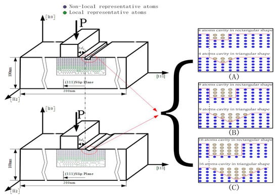 Figure 1. The schematic illustration of nanoindentation model with defects of a rectangular shape or triangular shape. (A) comparison model of defects with 4 atom cavity; (B) comparison model of defects with 9 atom cavity; (C) comparison model of defects with 16 atom cavity.