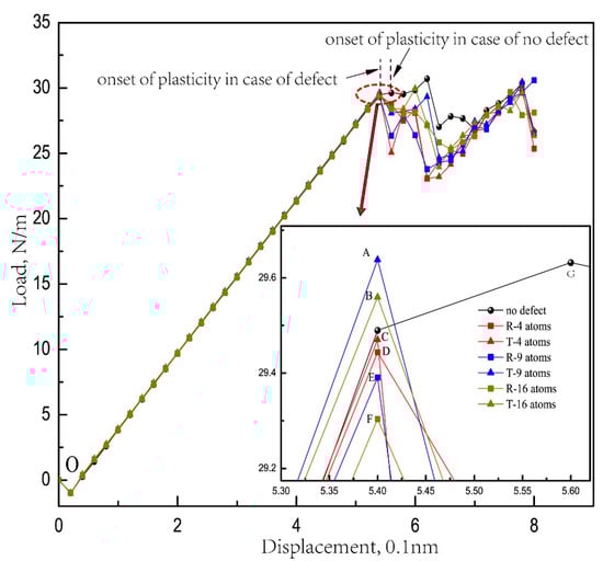 The load–displacement curve obtained from nanoindentation simulations with its magnifying illustration which clearly shows the first load peak is presented in Figure 2, where load is expressed by length units of the indenter in the out-of-plane direction with its unit N/m, and “R” and “T” respectively represent the defects with a rectangular shape and triangular shape. It can be seen from Figure 2 that the load curves gradually increase until the first load peak during initial loading processes (OA-OG), which indicates the elastic stages of Pt thin film, where OA-OF is the case of surface defects and OG is carried out with no defect for comparison.