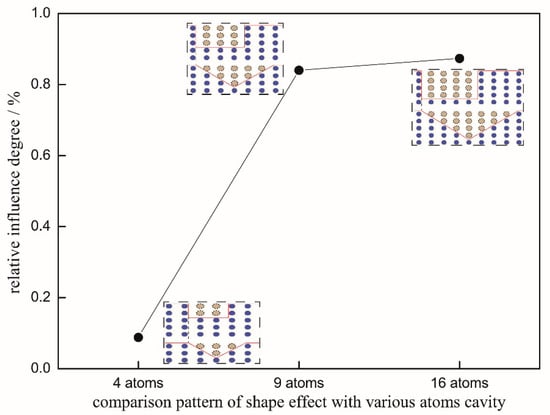 Furthermore, the relative influence degree η on nanohardness between thin films with triangular defect and rectangular defect with the same atom cavity can be calculated for further comparison by the equation: η = N T N R N R × 100 % , where N T , N R are, respectively, the nanohardness of Pt thin film with triangular defect and rectangular defect in the same atom cavity, namely a 4 atom cavity, 9 atom cavity, or 16 atom cavity in this simulation, just as Figure 3 shows. It can be easily figured out that the relative influence on nanohardness between the Pt thin films with triangular and rectangular defects in the same atom cavity gradually increases as the defects grows. Indeed, the differences in different defect shapes are generally less than 1%, as shown in Figure 3, as the relative influence degree seems tiny for the effect of the surface defect shape. So, it is necessary to make further discussion and explanation. Firstly, the difference is less than 1% in relative format but certainly large, around 160 MPa in absolute format (multiplied by the nanohardness of Pt, about 16 GPa). Secondly, along with the development of the bulk micromachining and nano-surface engineering, focusing on the various shapes of surface defects is increasingly popular and undeniably of great significance. In this paper, the micro-mechanism of how the different shapes of the surface defects influence the elastic–plastic transition of a thin film is more worthy of attention rather than the macro-aspects. Moreover, in consideration of the great significance of the study on the defect shape effect, even if there is no obvious effect between the rectangular defect and triangular defect, is also a kind of valid and significant conclusion.