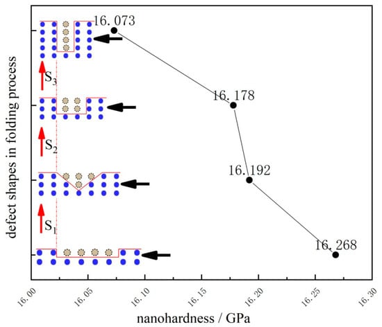 It is quite obvious that the nanohardness gradually decreases when the defect is folded from wide to narrow in the same atom cavity. The decline in the nanohardness in the three sections (S1, S2, and S3 in Figure 4) is of about 0.5%, 0.1% and 0.7%, respectively, suggesting that when the height of the surface defect increases (S1, S3 in Figure 4), it will induce a more obvious drop on nanohardness than the one with the defect height unchanged (S2 in Figure 4).