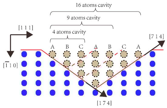 However, it is more complicated in the nanohardness of Pt thin films with triangular defects (as shown triangular symbols A, B, C in Figure 2), where Pt thin film with triangular defects with a nine atom cavity has the biggest nanohardness, while the one with triangular defect with a four atom cavity has the lowest value. According to the crystal structure of Pt, it can be calculated that the two orientations of the triangular defect are, respectively, [1 7 4] and [7 1 4], as shown in Figure 5, where the direction we are looking at the schematics is [ 1 ¯ 1 ¯ 2 ] . It is necessary to state here that the model in this paper is in fact two-dimensional, where the thickness of this model in the [ 1 ¯ 1 ¯ 2 ] direction is only the thickness of the unit cell, which equals the minimal repeat size, though it seems to be three-dimensional.