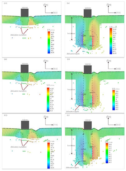 In order to make a further study on Pt thin films with triangular surface defects of 4, 9 and 16 atom cavities, the atomic positions and out-of-plane displacements have been probed. Figure 6 shows the snapshot of atom structure both at the critical load step of elastic-to-plastic transition and at the step of dislocation emission, where dimensions and displacements are within 0.1 nm. The nucleated dislocations can be easily seen beneath the indenter, as displayed in Figure 6A–C. Two Shockley partial dislocations that bound a stacking fault have emitted through dislocation glide deep into the ( 1 ¯ 10 ) plane with its dipole depth being 5.80, 6.42 and 6.06 nm, corresponding the simulation models of Pt thin films with triangular surface defects with 4, 9 and 16 atom cavities, as shown in Figure 6a–c, where the Burgers vector ( b ) is 0.277 nm.