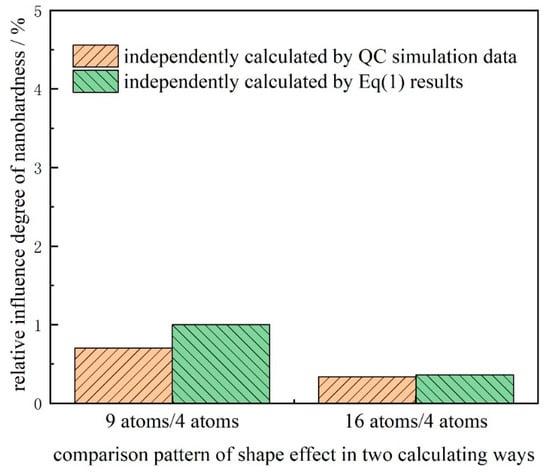 Figure 7 shows the relative influence on nanohardness of triangular surface defects independently calculated by QC simulation data or the results from Equation (1). It is necessary to further declare that the yellow symbol is the data by the equation: η QC = N QC Ti N QC T 4 N QC T 4 × 100 % , where N QC Ti is the nanohardness of triangular defect with a 9 atom cavity or 16 atom cavity, and N QC T 4 is the nanohardness of triangular defect with a 4 atom cavity, where the nanohardness is obtained through the load-displacement curve in QC simulation, as shown in Figure 2. The green symbol is the data by the equation: η eq = N eq Ti N eq T 4 N eq T 4 × 100 % , where N eq Ti is the nanohardness of triangular defect with a 9 atom cavity or 16 atom cavity, and N QC T 4 is the nanohardness of triangular defect with a 4 atom cavity, where the nanohardness is calculated by the formula (Equation (1)), applying each depth of emitted dislocation dipole h, as shown in Figure 6.