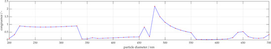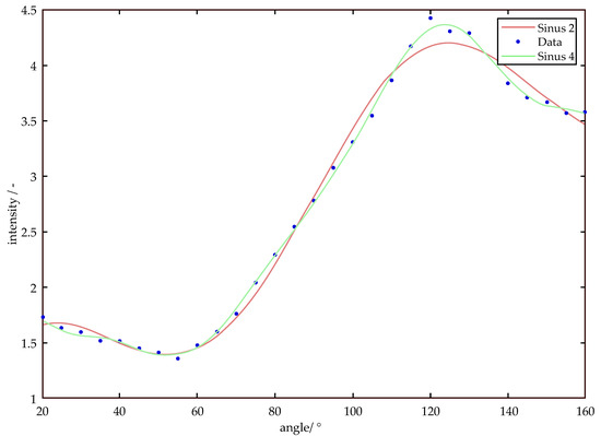 The appropriate function is selected by determining the minimum MSE. Typically, curves with zero or one extremum can be modeled with a single sine (Equation (5)), whereas three or more extremes require multiple sine functions (Equation (6)), which is the case for particles smaller than 650 nm. In order to approximate larger particles and to improve the approximation of smaller particles, a total of 5 sinusoidal functions are used, an example is shown in Figure 2. However, especially with small particle sizes, care must be taken that the measurement curves are not overdetermined, since small measurement outliers and fluctuations may be included in the approximation.