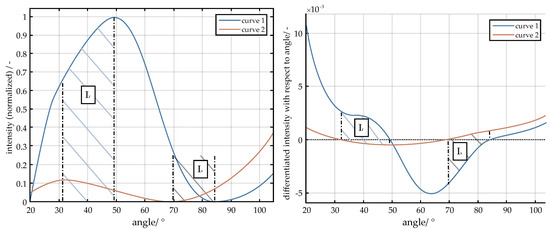 In the first step of the comparison, the curves are partitioned and divided into two areas, one of which includes the intervals Ip to Iq, in which the slope of the two curves have the same sign, while the other area is composed of the remaining intervals Ir to Is where the slopes have opposite sign. For each of the two areas, each area is integrated over the respective intervals, see Equation (7). The variables represent a measure for the congruence of the two curve.