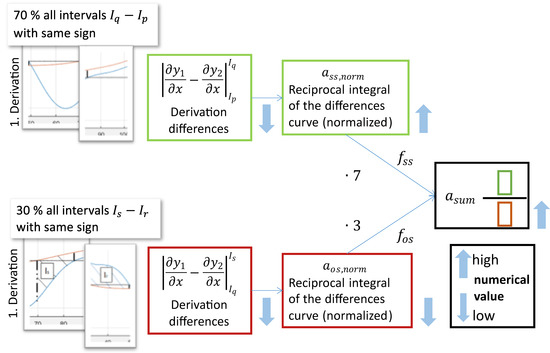 By forming the reciprocal, the variable a ss increases as the difference between derivatives decreases, i.e., higher agreement of the curves, whereby the positive effect is amplified. By computing Equation (7) on all curves to be compared, two vectors containing the positive and negative congruence of each curve is obtained. In the next step, two vectors are divided element wise to determine the overall congruence, as shown in Equation (8). Where f is described in Equation (10). The variable a sum has the same dimensions as a ss and a os.