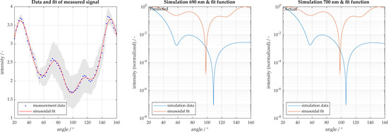 Detailed analysis of the silica particles of diameter 681 nm are shown in Figure 7 and Figure 8. The particles were characterized accurately with a size of 690 nm. Figure 6a contains a representation of the measurement signal with the sinusoidal fit function, which was described previously. Additionally, 95% confidence intervals are displayed, whereby the sample size was 65 measurements. Figure 7b displays the simulation curve found to be most congruent with the measurement signal. Figure 7c displays the expected simulation curve, known a priori. Figure 8 displays the vector a sum, described previously, which is the congruence of the measurement signal to each simulation, where a single peak is present at approximately 700 nm.
