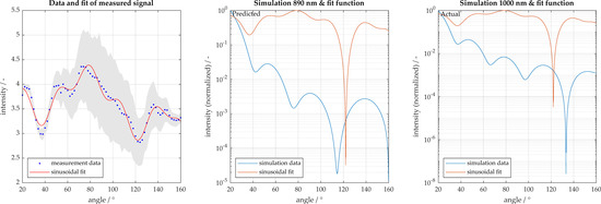 The size of the measured particles is determined by measuring the angle dependent intensity and comparing theory and experiment. The measurement signals are processed and thereafter evaluated in order to estimate particle size, which is predicted by the best fit. First the signal is approximated using sinusoidal functions [52]. This approximation aids in smoothing out the measurement signal and identifying signal features which can be used to estimate the particle size. Following the approximation, our proposed method is used to find the closest matching measurement signal from a database of light scattering simulations.