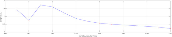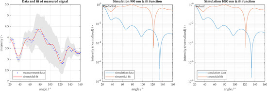 Polystyrene particles of sizes 500 and 1000 nm were also analyzed. The 500 nm particles are accurately characterized as being 460 nm. Figure 9a displays a representation of the measurement signal for 1000 nm with the sinusoidal fit function. A 95% confidence interval is also displayed, whereby the sample size here was 55 measurements. When reviewing the analysis of the 1000 nm particles, these are incorrectly characterized as 890 nm as shown in Figure 9b. In order to improve the characterization, the number of local maxima in the measured signal are considered, and only the simulations with similar number of extrema are used for characterization. These results are shown in Figure 10. When using only the filtered potential particle sizes, the algorithm is able to narrow down potential fits, more accurately estimating 990 nm. The corresponding simulation is shown in Figure 11 with the associated congruence in Figure 12. This demonstrates the importance of measuring with high angular resolution in order to be able to resolve the individual peaks in the scattering signals.