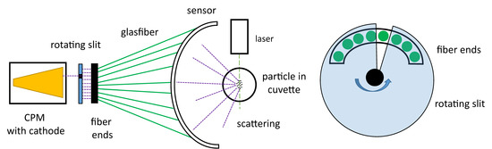 Based on these results an approach for an industrial optical setup is proposed as seen in Figure 13. The goniometer is replaced by a fiber bundle in order to remove the need to rotate a single optical fiber around the measurement cuvette. The fiber ends are lined up next to each other in an arc, whereby 71 fibers are needed. A rotating slit allows only one optical fiber to be exposed at a time and forward photons to the cathode of the CPM. By adjusting the sampling rate of the CPM’s and the rotational speed of the slit, a measured value can be recorded for each angle. With a slot rotation rate of 20 Hz and a sampling rate of 20 kHz of the CPM’s and 71 fibers, several values per second per fiber can be recorded facilitating measurement of changing particle sizes.