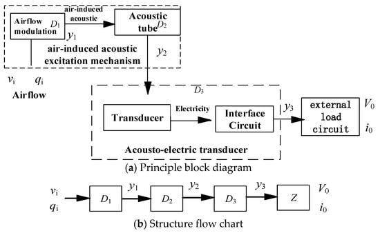 Figure 1 shows the working principle of the airflow-induced acoustic piezoelectric generator [,]. The generator system is composed of an airflow-induced acoustic excitation mechanism and an acoustic–electric transducer. As shown in Figure 1a,b, the airflow-induced acoustic excitation mechanism includes an inflow modulation mechanism (D1) and an acoustic tube (D2), the acoustic–electric transducer (D3) includes a piezoelectric vibrator and an electrical energy processing circuit, and Z is the load on the power supply side.