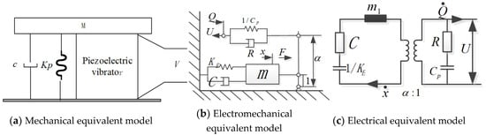where, F is the excitation force, that is, the acoustic excitation in the resonant cavity, F = F0 sinωt, x is the vibration displacement of the piezoelectric vibrator, c is the equivalent damping coefficient of the acoustic–electric transducer, is the equivalent stiffness of the mechanical system, and is the piezoelectric return force of the acoustic–electric transducer.
