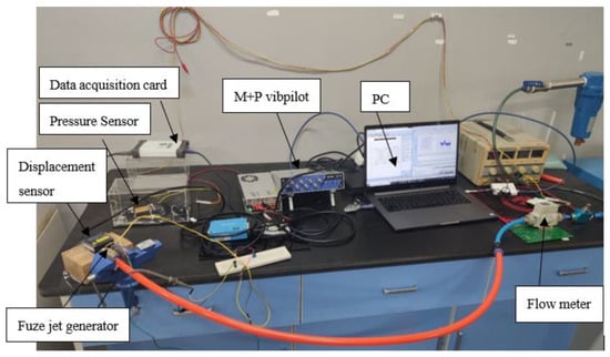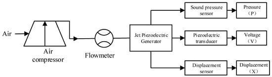 Figure 4 and Figure 5 show the blowing test process and experimental system, respectively; we use an air compressor to blow the air to simulate the external ballistic environment. The pulsation pressure sensor measured the sound pressure curve at the bottom of the cavity, and then recorded the measurement value of the pulsation pressure sensor through the data acquisition card, and the laser displacement sensor recorded the vibration displacement curve of the piezoelectric vibrator, and finally through spectrum analysis, analyzed the sound pressure frequency and the vibration frequency of the piezoelectric vibrator. Figure 6 shows a physical picture of the airflow-induced acoustic piezoelectric generator