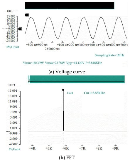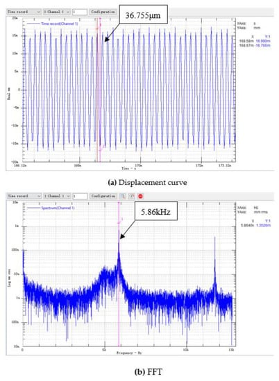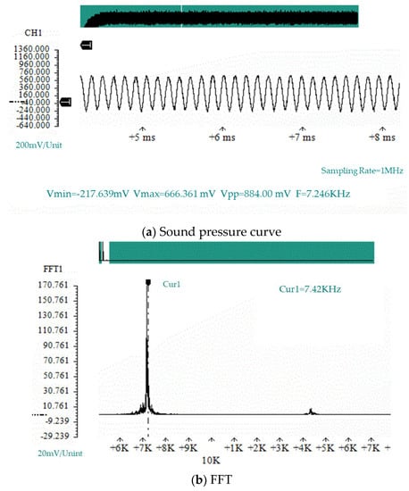 According to the sound pressure curve and spectrum analysis diagram shown at the bottom of the resonant cavity in Figure 7, the frequency of the sound pressure vibration was 7.24 kHz. According to the sound pressure curve, the vibration of the sound pressure followed a sinusoidal vibration curve with stable amplitude, which conforms to the assumption of the force given in the acoustic and electrical energy exchange model in Section 3.2.