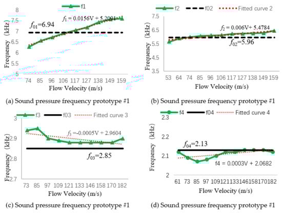 In accordance with the fitting curve in Figure 8, the resonance flow rates of the four prototypes were substituted into their fitting curve equations. The sound pressure frequency of prototype #1 at its resonance velocity was , the sound pressure frequency of prototype #2 at its resonance velocity was , the sound pressure frequency of prototype #3 at its resonance velocity was , and the sound pressure frequency of prototype #4 at its resonance velocity was . It can be seen from the fitting equation that the slope of the curve gradually decreased, indicating that the longer the resonant cavity, the closer the detected sound pressure frequency value is to the first-order resonance frequency, which verifies the rationality of the structural parameter design presented in Section 3.1.
