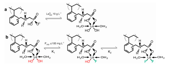 Sorbent resin chemistry. (a) Activation of PurometTM MTS9501 resin with trivalent metal (for example, La) for later fluoride uptake. (b) Ligand exchange (F− for OH−) when La-activated PurometTM comes in contact with aqueous F− (e.g., from NaF) based on [18]. Note: The full La inner coordination sphere is not shown for reasons of space.