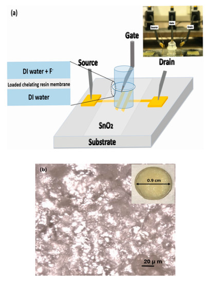 Measurement setup and membrane morphology. (a) Water-gated thin-film transistors (WGTFT) setup for fluoride sensing. Inset to 2a: photograph of the chelating resin-sensitised SnO2 WGTFT sensor platform. (b) Micrograph of La-loaded chelating resin distributed in poly(vinyl chloride) (PVC) phase transfer membrane, in which the darker section of the image is for resin while lighter is for PVC. Inset to 2b: Photograph illustrates the diameter of La- chelating resin-loaded PVC phase transfer membrane. Resin loading in the membrane was 5.6 mg.