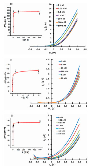 For both La- and Al-loaded membranes, transfer characteristics clearly shifted to more positive gate voltages under increasing fluoride concentration. For the La resin, this trend was already observed for a fluoride concentration of only 10 pM. This showed that metal-loaded membranes developed a potential in response to very small fluoride concentrations in the sample under test. Threshold shift was evaluated quantitatively, as described in Section 2.4. The resulting response characteristics for both La- and Al-loaded resin are shown as insets to Figure 3b, Figure 4b and Figure 5b, respectively, including fits to the LF model Equation (3). The data line up on a smooth curve fitted well by the LF law, without random scatter. This is empirical confirmation that the use of DI water in the reference pool here did not lead to unstable reference potentials. Table 1 summarises the parameters K, c1/2 = 1/K, ΔVth(sat), and β for the best fit to Equation (3), as well as LoDs. Evaluation of LoD was as described in 2.4. and is shown in the Supplementary Materials, Figure S1.