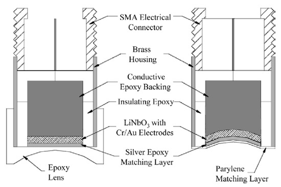 - Cannata, J.M.; Ritter, T.A.; Chen, W.H.; Silverman, R.H.; Shung, K.K. Design of efficient, broadband single-element (20-80 MHz) ultrasonic transducers for medical imaging applications. IEEE Trans. Ultrason. Ferroelectr. Freq. Control 2003, 50, 1548–1557. [Google Scholar] [CrossRef]