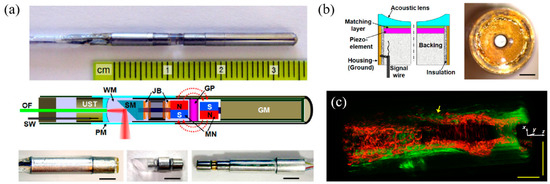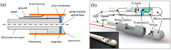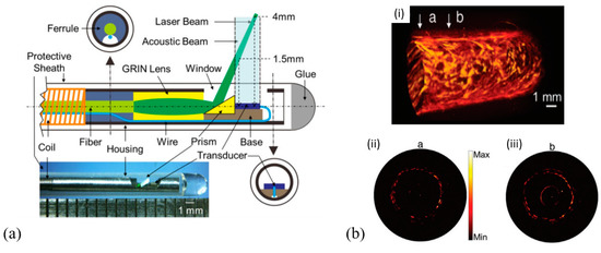 - Guo, Z.; Li, Y.; Chen, S.-L. Miniature probe for in vivo optical- and acoustic-resolution photoacoustic microscopy. Opt. Lett. 2018, 43, 1119. [Google Scholar] [CrossRef] [PubMed]