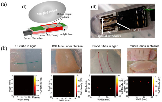 - Chen, J.; Wang, M.; Cheng, J.C.; Wang, Y.H.; Li, P.C.; Cheng, X. A photoacoustic imager with light illumination through an infrared-transparent silicon CMUT array. IEEE Trans. Ultrason. Ferroelectr. Freq. Control 2012, 59, 766–775. [Google Scholar] [CrossRef]