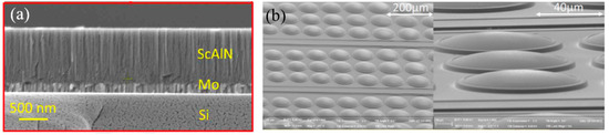 | Material | Frequency Range (MHz) | Bandwidth (−6 dB) | Piezoelectric Layer Thickness (μm) | Device Size (mm) | Fabrication |