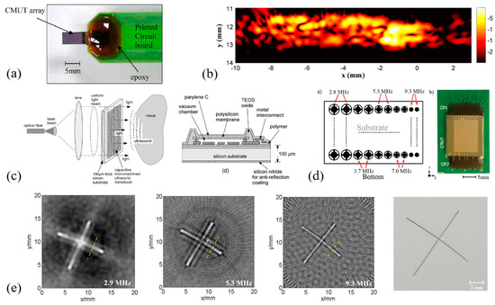 - Ilkhechi, A.K.; Ceroici, C.; Li, Z.; Zemp, R. Transparent capacitive micromachined ultrasonic transducer (CMUT) arrays for real-time photoacoustic applications. Opt. Express 2020, 28, 13750. [Google Scholar] [CrossRef] [PubMed]