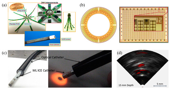 - Nikoozadeh, A.; Oralkan, Ö.; Gencel, M.; Choe, J.W.; Stephens, D.N.; De La Rama, A.; Chen, P.; Lin, F.; Dentinger, A.; Wildes, D.; et al. Forward-looking intracardiac imaging catheters using fully integrated CMUT arrays. Proc. IEEE Ultrason. Symp. 2010, 2, 770–773. [Google Scholar] [CrossRef]