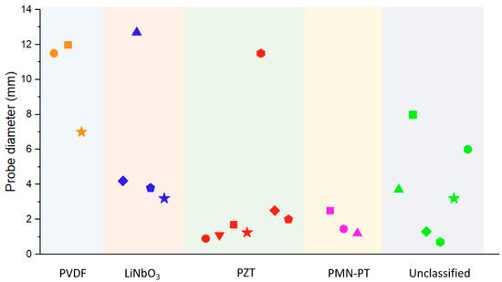 | Marker | Piezoelectric Material | Probe Diameter (mm) | Frequency (MHz) | Ref. |