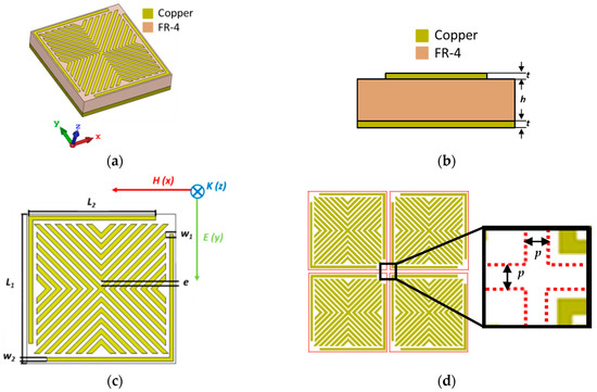 Figure 1 shows details of the proposed MM structure. This MM consists of three layers (Figure 1a,b). The middle layer is the FR-4 dielectric substrate with a real part of the permittivity of 4.3, a loss tangent of 0.025 and thickness h of 3.2 mm. The top and bottom layers are made of copper with an electric conductivity of 5.8 × 107 S/m and thickness of t = 17 µm. The bottom copper layer is a continuous film that plays the role of a perfect reflector, while the top is formed of symmetrical copper resonators with the geometry shown in Figure 1c; it consists of 15 mm × 15 mm unit cell with a periodicity p = 0.04 mm (Figure 1d). Table 1 summarizes the dimensions of the Vshape resonator.