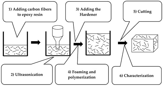 Figure 2 summarizes the different steps of the elaboration method of the composite. First, the CFs (from Apply Carbon SA, Languidic, France) are dispersed in the epoxy resin (PB 170 from Sicomin, Châteauneuf-les-Martigues, France) using ultrasonication method (Sonics Materials VCX-750-220, Sonics & Materials, Inc., Newtown, CT, USA), as detailed in [61]. Subsequently, the hardener (DM 02 from Sicomin) is added with the proportions Resin: Hardener of 10:3.6. After that, the mixture is put into a mold, for foaming and polymerization steps, for six hours at room temperature.