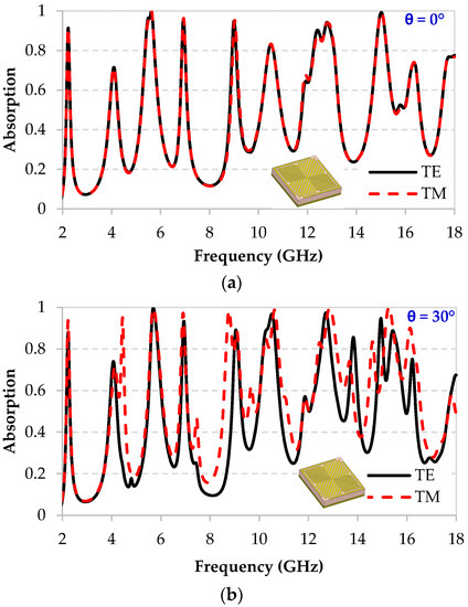 From the measured reflection coefficient, in Figure 9 we present the deduced absorption performance for TE and TM polarizations at normal incidence (Figure 9a) and at oblique incidence of 30° (Figure 9b,c). These measurements are compared to the simulation results. It can be noted here that good agreement between measurements and simulations is obtained and the same resonances are observed, even if the absorption level is slightly different. For example, for the normal incidence (Figure 9a), a lower intensity is obtained at 2.3 GHz, with an expected absorption of 90% by simulation and an obtained absorption of 63% by measurement. For the other resonances, the same or even better absorption is obtained; for example, at 4.2 GHz, the expected absorption by simulation is 70.9% while an absorption of 77% is achieved by measurement. The weak difference observed between the simulation and measurement results is probably due to a geometric deviation between the perfect simulated structure of the MM and the produced one.