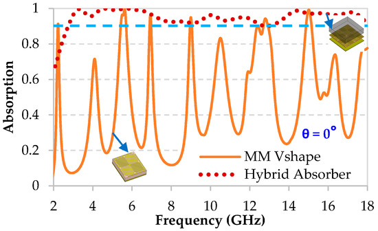 Simulation results of the absorption performance of the hybrid absorber compared to that of the MM for the normal incidence θ = 0° (the blue dashed line corresponds to the absorption value of 90%).