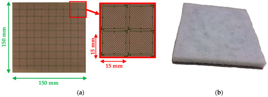 The proposed MM absorber is fabricated with 10 × 10 unit cells with a total dimension of 150 mm × 150 mm × 3.2 mm while using laser printing technique with LPKF laser machine of the IETR laboratory. Figure 8a shows the top view of the fabricated structure. The elaborated dielectric layer that is made of epoxy loaded foam is cut to the desired thickness, 13 mm. This latter is glued on the top layer of the elaborated MM to compose the proposed hybrid absorber (Figure 8b).