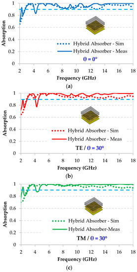 The measured absorption performance of the hybrid absorber at normal incidence, as well as, at an oblique incidence of 30° for TE and TM polarizations are presented in Figure 10a‒c, respectively. These measurements are also compared to the simulation results. Note that, a good agreement between measurements and simulations is obtained and it confirms a high absorption performance greater than 90% for frequencies between 2.6 GHz and 18 GHz, excluding the frequency range between 4.10 GHz and 4.45 GHz. The decrease of the absorption level in this narrowband is due to the relatively high coupling, in this frequency band, and between the horn antennas used for the measurements in the anechoic chamber.