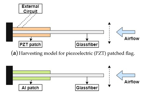 In this paper, the PEH is based on the flag-flutter mechanism in which the harvester is considered to be a fiberglass plate as shown in Figure 1. For energy harvesting purposes, the bimorph configuration of PIC 255 (PZT material) is attached to the host structure provided with electronic circuits as shown in Figure 1a. For the validation of the designed energy harvesting model, another model is constructed. In this model, the same strategy is used as of PZT attached harvester except for two Aluminium (Al) patches without external circuits, which are attached to the fixed end of the host structure as shown in Figure 1b. These designed harvesters experience the airflow, resulting in LCOs, the PZT patches absorbs the flow-induced structural vibrations and transform them into useful electrical energy. The overall mechanism of PZT energy harvesting by the flag-flutter mechanism is shown in Figure 1. The geometry of the harvester is represented in Table 2 and the material properties of the harvester are shown in Table 3.