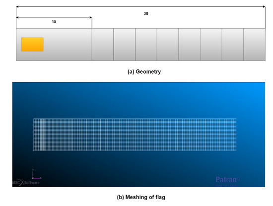 The Doublet Lattice Method (DLM) is used for aeroelastic analysis. For the unsteady flow, the DLM is an extension of the steady vortex-lattice method (VLM) to unsteady flow. To analyze flow-induced structural vibrations, the solver couples the structure and flow, for every interval value of airflow velocity. The unknown lifting pressures are assumed to be concentrated uniformly across the one-quarter chord line of each aerodynamic panel as described in the modelling part as shown in Figure 2b. The total number of nodes and elements in the meshing of the flag during the numerical analysis is 1765 (17 cm) to 2625 (38 cm) and 1344 (17 cm) to 2496 (38 cm) respectively. The number of nodes and elements used in meshing during the numerical analysis are represented in Table 4.