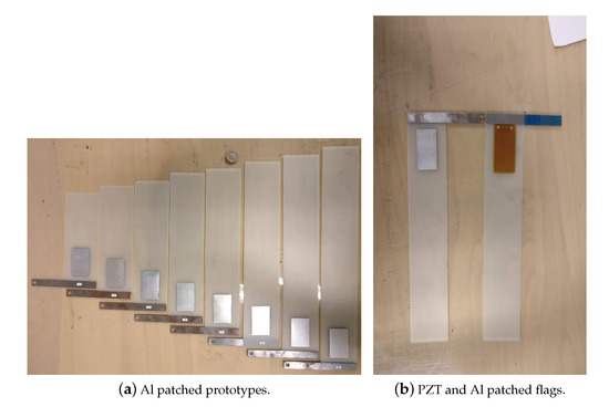 For numerical simulations, MSC Nastran software SOL 145 (2017, MSC Software, Newport Beach, CA, USA) is used for understanding the phenomenon of energy harvesting by the flag-flutter mechanism. The overall numerical model of the flag is represented in Figure 2. To have an in-depth knowledge of the harvesting mechanism, the modeled flags were of different lengths and configurations as represented in Figure 2a. The dimensions of the flag and PZT element is represented in Table 2. Three different configurations of the numerical model are constructed in this phase; (i) flag with Al patch attached, (ii) flag with no patch attached, and (iii) flag with PZT patch attached. These configurations are realized to predict the optimal output power and exploring of a wide range of airflow velocity for the flutter analysis.