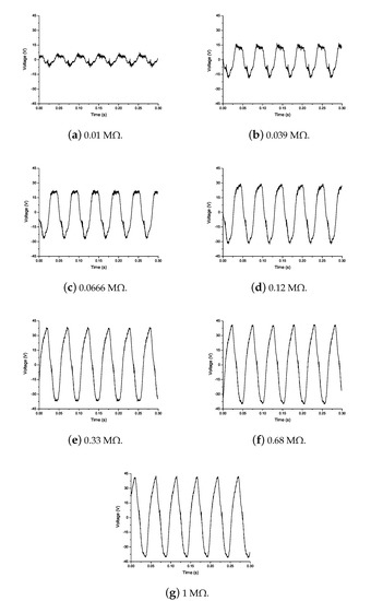 The flag attached to the PZT patch was subjected to the airflow until the flutter velocity and phenomenon of LCOs occurs. The PZT patch absorbs flow-induced structural vibrations and transforms it into electrical energy. The voltage generated is measured by a cathode-ray oscilloscope. The experimental campaign is carried out from 0.01 M to 1 M external resistance, for the prediction of the optimal resistance, as represented in Figure 6. The increase in the amplitude of voltage generated can be observed from 0.01 M to 0.33 M resistance, after this point, the output voltage remains approximately constant. Thus, 0.33 M resistance is considered to be an optimal resistance with a 35 V output voltage. The time response obtained experimentally represented a nonlinear behavior because the piezoelectric patch attached to the flag absorbed structural vibrations from limit cycle oscillations that are nonlinear in behavior, resulting in nonlinear voltage generation with respect to time.
