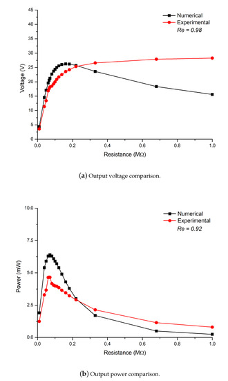 Output voltage and power generated comparison of numerical and experimental data with correlation value; where represents the correlation value.