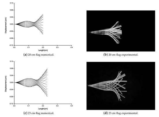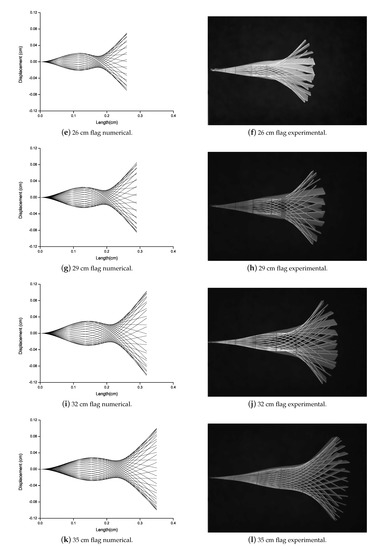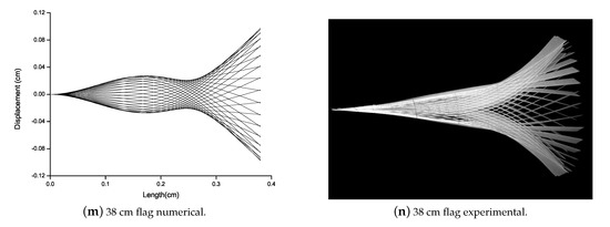 Eugeni et al. [42] studied that when the flag is subjected to airflow, flutter occurs abruptly resulting in the flapping of the flag. In this work, to capture this flutter mode vibrations, numerical and experimental study is carried out. Flutter vibration mode of all the flags attached with the Al patch is analyzed numerically and experimentally as shown in Figure 8. For all the flags attached with the Al patch, there is no mode shape variation. The numerical and experimental data are good in agreement. As the torsion is not predicted numerically and with the larger length of the flag the torsion is more. Therefore, a difference can be observed between numerical and experimental results of 35 cm and 38 cm length of the flag.