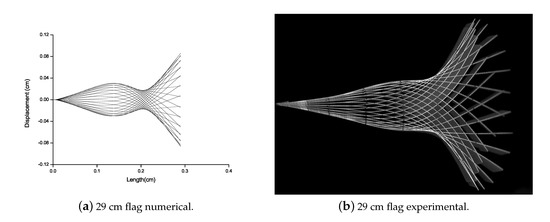 Flutter vibration mode of the PZT patched flag is analyzed via numerical and experimental campaign as shown in Figure 9. There is no mode shape variation for the flag attached to the PZT patch. Therefore, the numerical and experimental results are good in agreement.