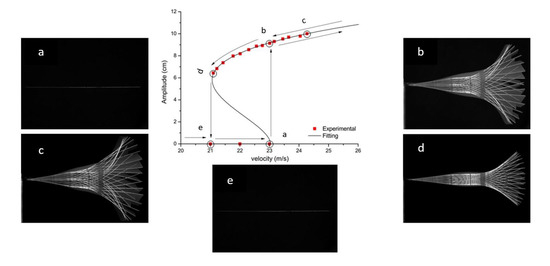 For the flag attached with the Al patch, a hysteresis loop is observed for the bifurcation diagram as shown in Figure 10. When the Al patched flag is subjected to airflow, it remains stable until 23 m/s as shown in Figure 10a. At this point, flutter arises abruptly and the flag starts flapping as shown in Figure 10b. When gradually increasing the velocity above the flutter velocity the amplitude of the vibrations increases as shown in Figure 10c. By gradually decreasing the velocity to the flutter velocity, it is observed that the flag still flaps but with a less amplitude as shown in Figure 10d. When the velocity is further decreased, the flag tends to stable again as shown in Figure 10e. In Figure 10, the hysteresis is observed representing a fifth-order fitting sub-critical bifurcation for the Al patched flag.