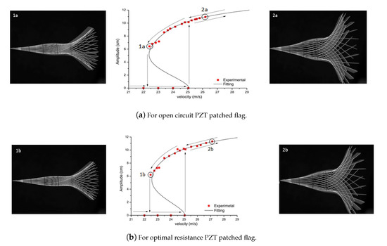 The same strategy is applied to flag attached with PZT patches i.e., with open circuit (as shown in Figure 11a) and with optimal resistance (as shown in Figure 11b). In both cases, the flag is stable until 25 m/s, and at this point, flutter starts abruptly resulting in the flapping of flag. PZT patched flag for both cases represents the hysteresis loop. In Figure 11, the hysteresis is observed representing a fifth-order fitting sub-critical bifurcation for the PZT patched flag. The jump can be observed in both cases of bifurcation diagram as represented in Figure 11. It is suggested that this jump is due to the presence of an unstable branch or due to the effect of PZT interaction on the host structure.