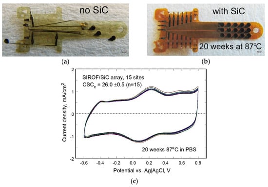 From the development experiences of earlier generations of our team’s visual prosthesis, we gradually came to appreciate the unique and intersecting challenges that were summarized in Table 2 concerning the impact of added encapsulating films on the bio-stability and biocompatibility of the devices in the eye environment. Early non-hermetically encapsulated visual prosthesis components micro-fabricated by our team had vapor-deposited protective coatings of Parylene-C applied (Figure 1a,b) including the use of organosilane adhesion promoters and careful surface preparation before coating and patterning using oxygen reactive ion etching. Despite these precautions, we found that Parylene-C coatings alone had useful lifetimes in saline environments of at best 1–2 years at 37 °C. This was adequate, for example, for some in vitro and early in vivo testing, but fell short of our ultimate design lifetime target of 10+ years. After evaluating a number of potential encapsulants [27], we eventually settled on “wrapping” the conductors in our arrays with plasma enhanced chemical vapor deposition (PECVD) of amorphous silicon carbide (a-SiC:H) at 325 °C, which showed excellent long-term material and electrical stability in accelerated life tests at 87 °C (see e.g., Figure 2). These inorganic encapsulating layers were used above and below each layer of conductors, which we kept near to the neutral axis of the arrays to minimize any effects of internal film stress. The presence of a-SiC:H layers in the multi-layered electrode array structure also contributed to their overall stiffness, which was compensated for in part by adjusting the thickness of the outer polymer layers of the micro-fabricated components for scratch protection.